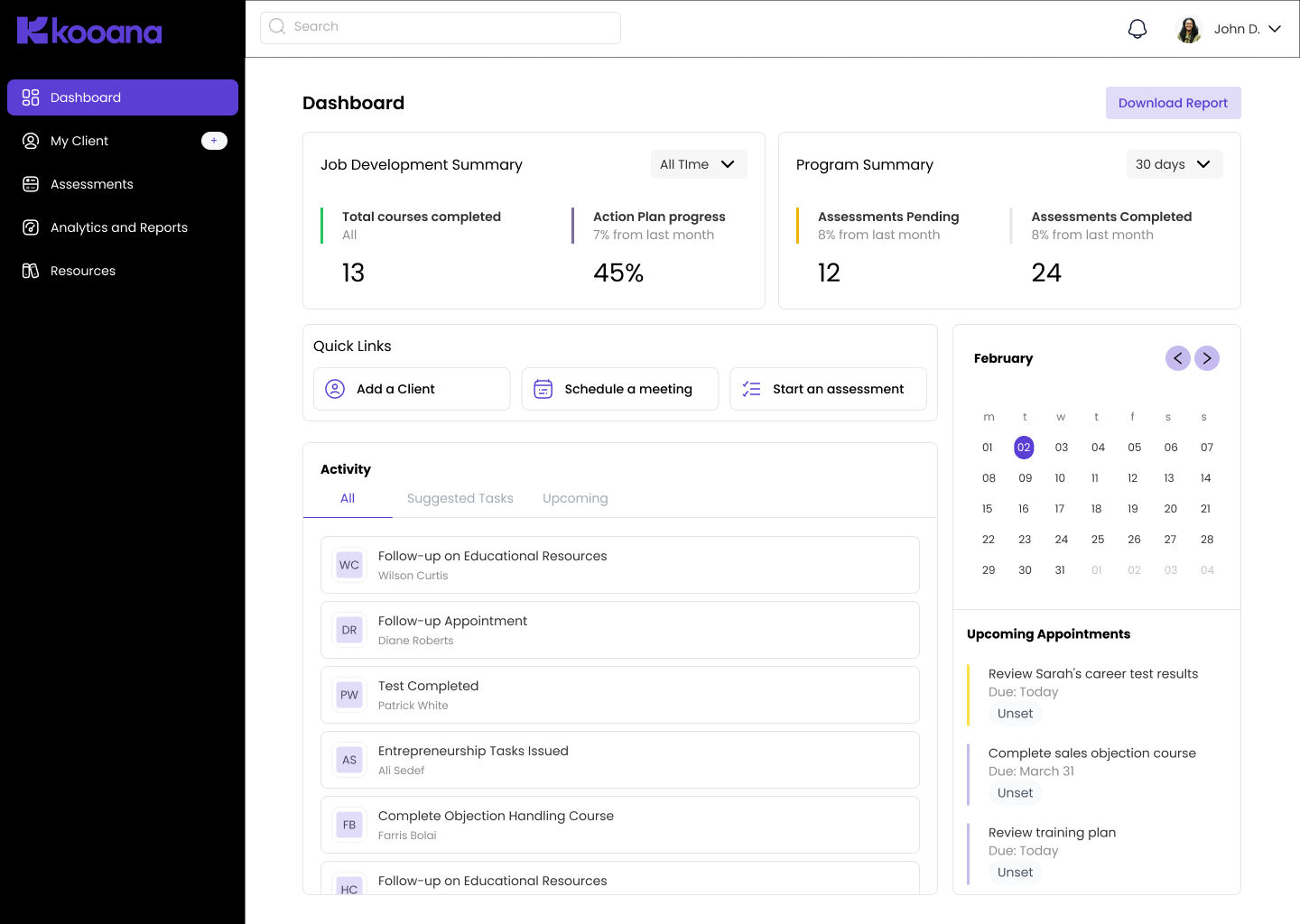 Kooana is a unified platform that strengthens job developer performance, enhances employer engagement, and streamlines workforce program delivery. It equips teams with essential skills, manages participants, tracks outcomes, and collects data to support program success and future funding.